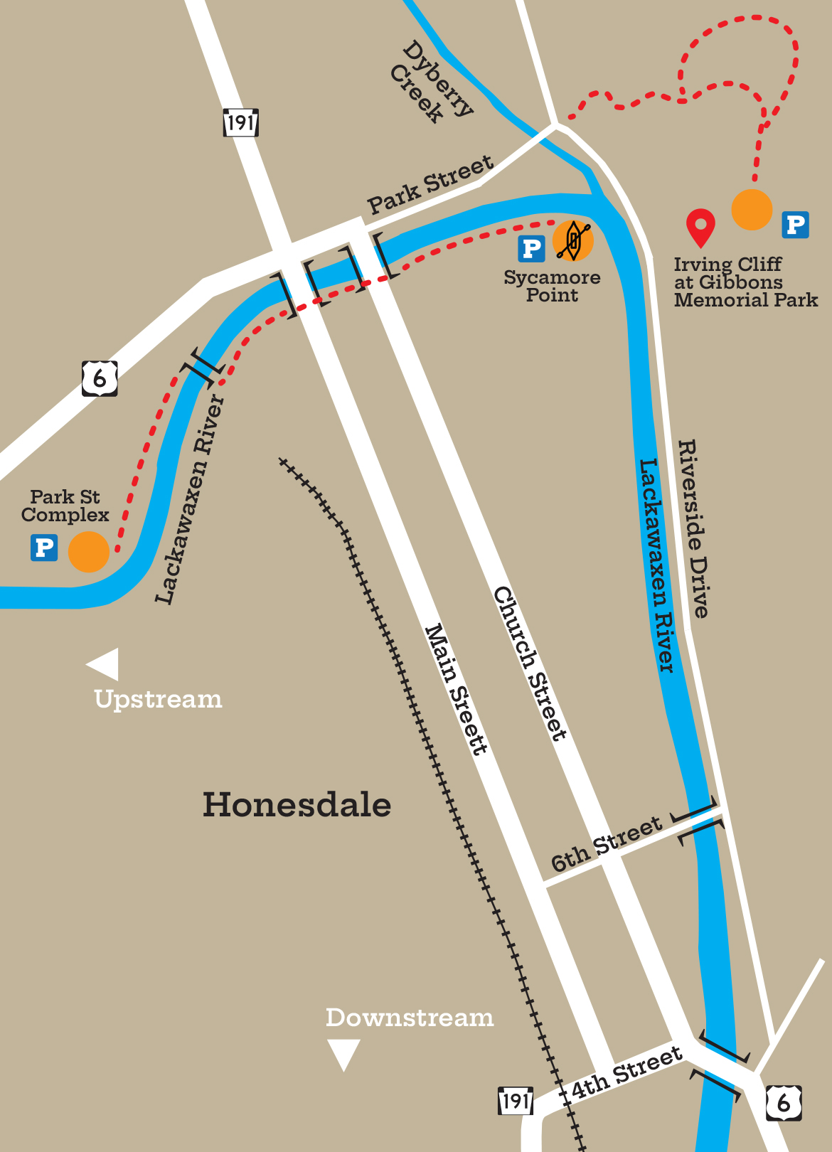 Providing panoramic views of Honesdale, Irving Cliff and Gibbons Memorial Park are perfect for hikes, sunsets, picnics and so much more. The Richard “Dick” Smith Memorial Star shines from atop the cliff each holiday season. A system of trails weave throughout the 55-acre public park accessible from the top and bottom of the cliff. From here, walk to other points of interest in Honesdale including the Park Street Complex and the new Sycamore Point river access